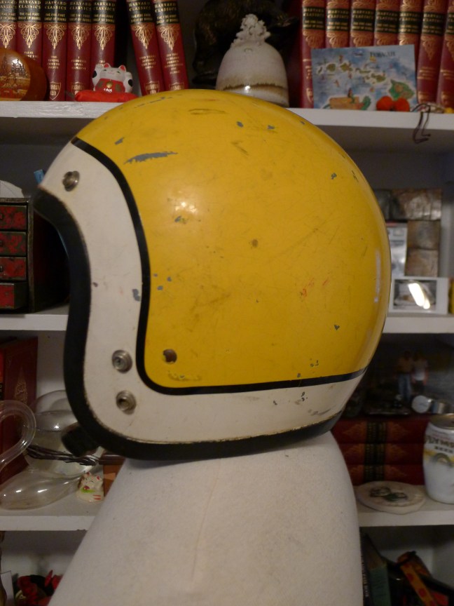 The Bell -Toptex Shorty helmet debuted in the early 1960s and was popular among motorcyclist through the end of the decade. the low profile and light nature made it a perfect helmet for roaming the cities and country roads on Triumphs, Harleys and small displacement UJMs. The helmet was Snell Memorial Foundation approved, predating DOT ratings and was very similar in style to the Buco Guardian helmets of that day. The shell extends down to about the top of the ear and a vinyl collar in connection with the chin strap secure and protect the rider from excessive wind. A variety of visors and shields were available for the front.
