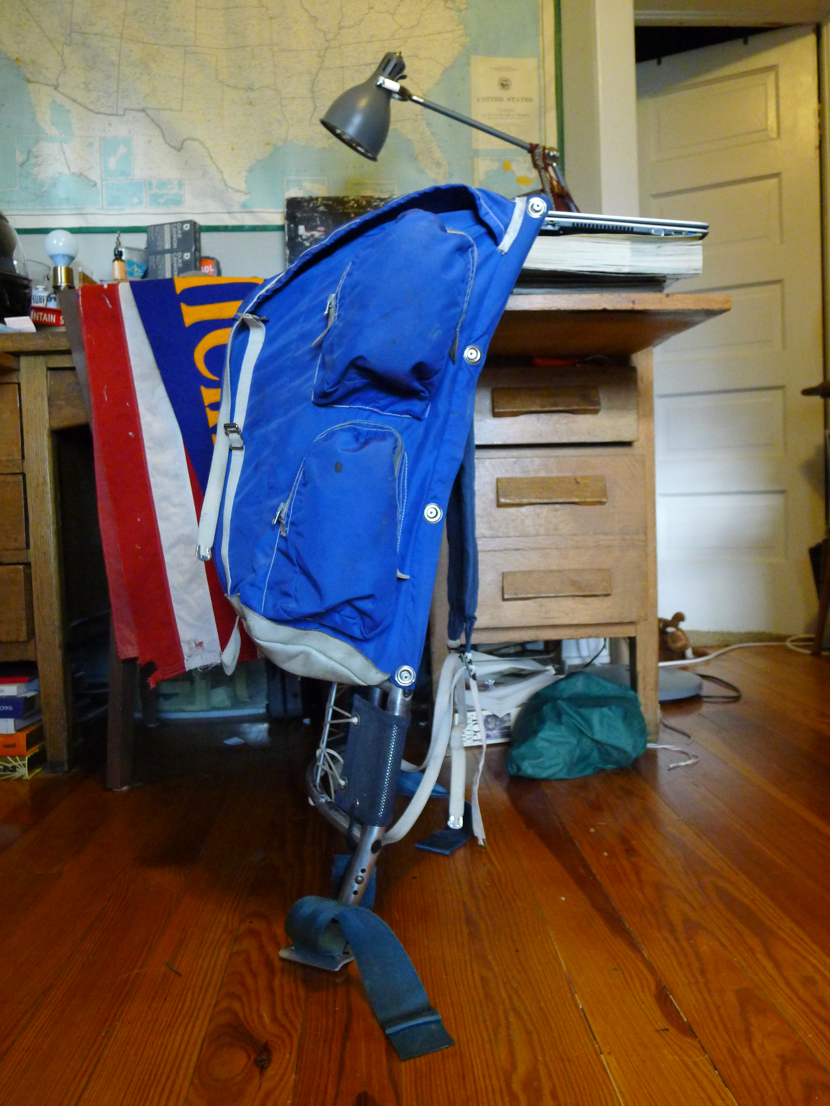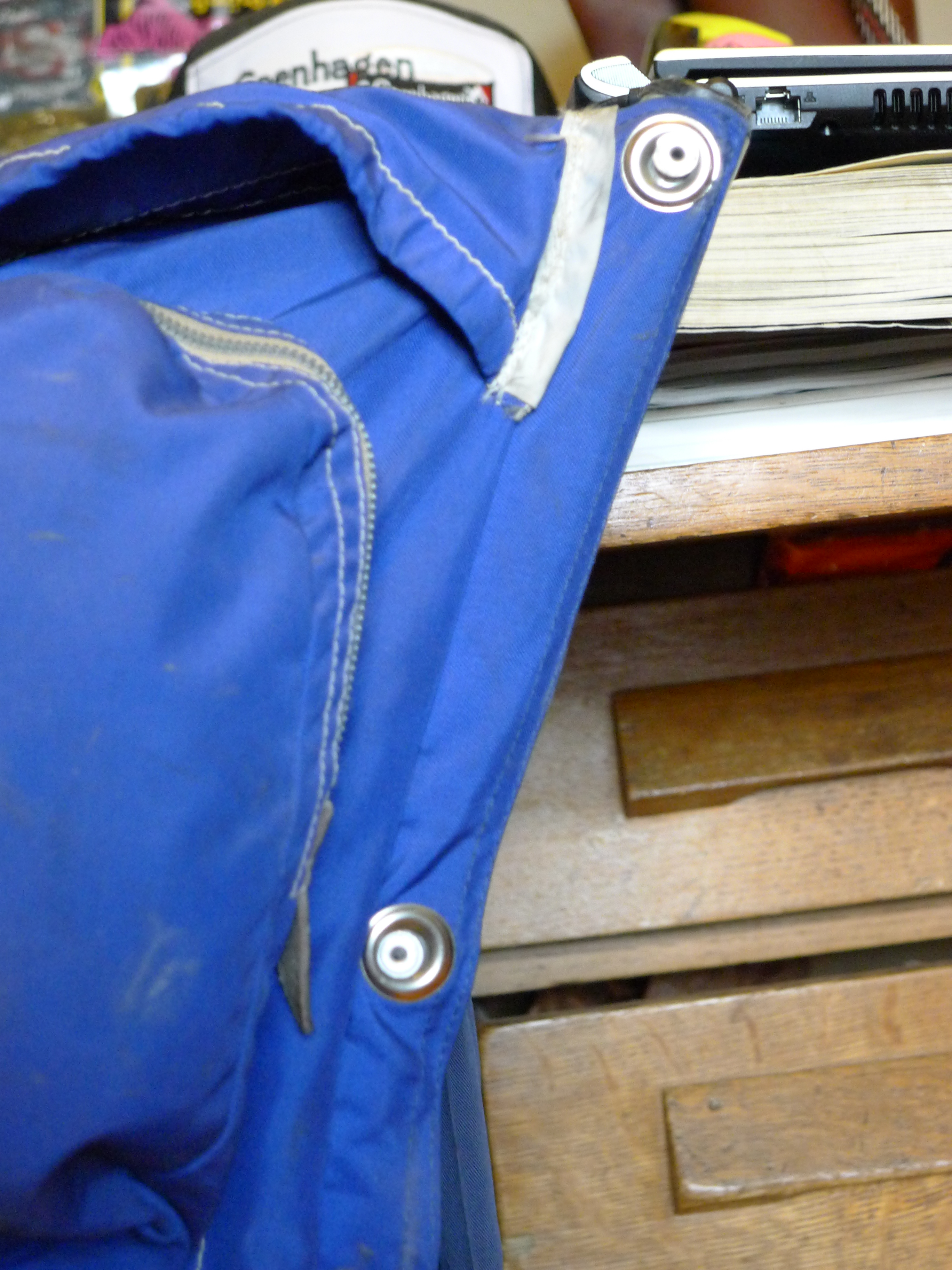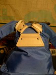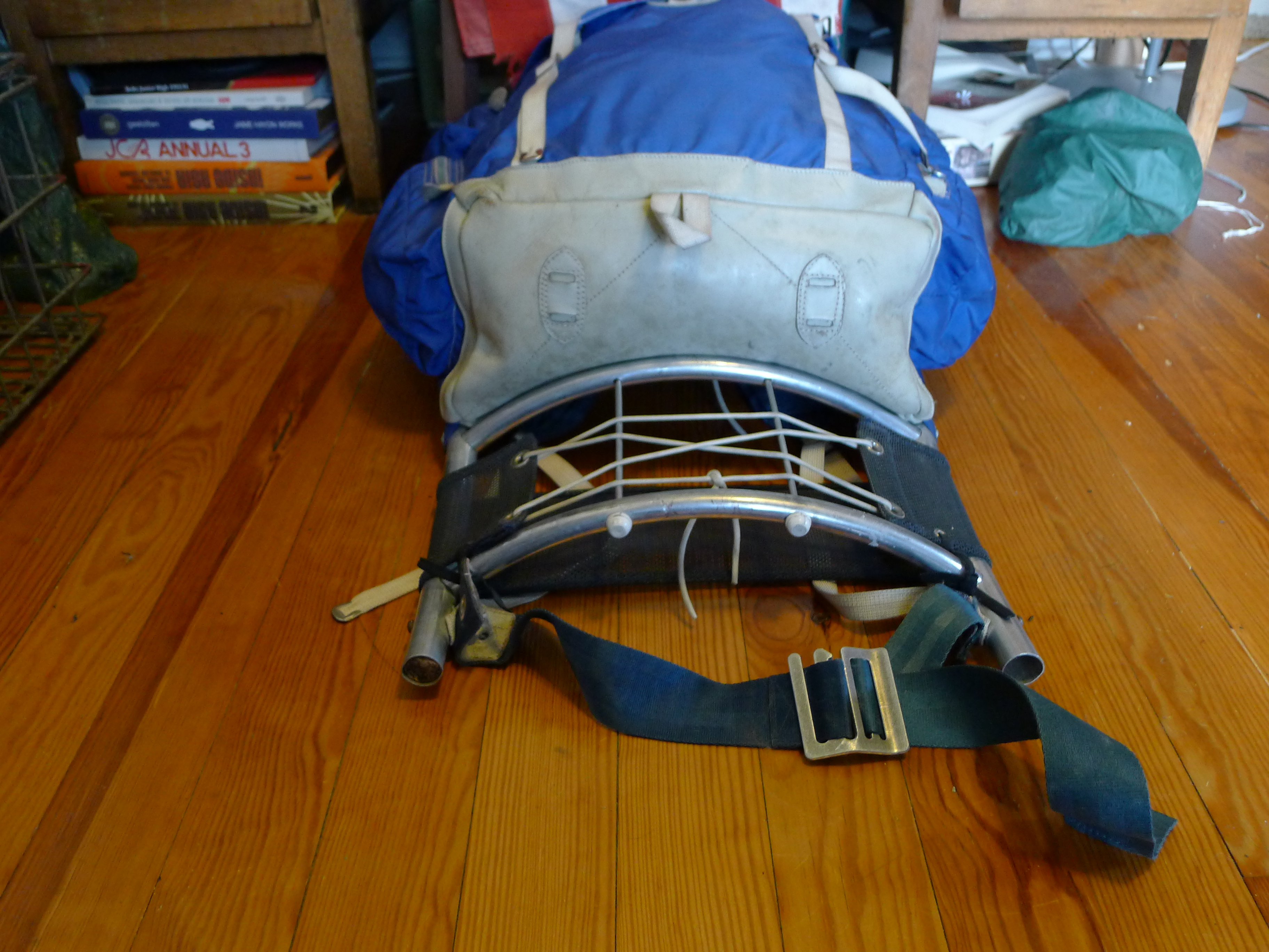 The material on the pack is pretty standard for the time. A heavy, coated nylon in a royal blue. Perhaps the biggest wow factor, aesthetically at least, comes from the green duck canvas backing which extends from just above the shoulder straps down to the inside of the “dewlaps”. With this pack adhered to he wearer’s back, I am sure the duck canvas offered at least some sweat absorption. Shoulder straps are reinforced with a riveted leather backer and feed down into the body of the pack. There’s an ergonomic crescent shape to them and they’re lightly padded. Standard leather lashing points adorn the body of the bag for side canister compartment attachments, axes, skis, poles or whatever else one would need for the adventure.