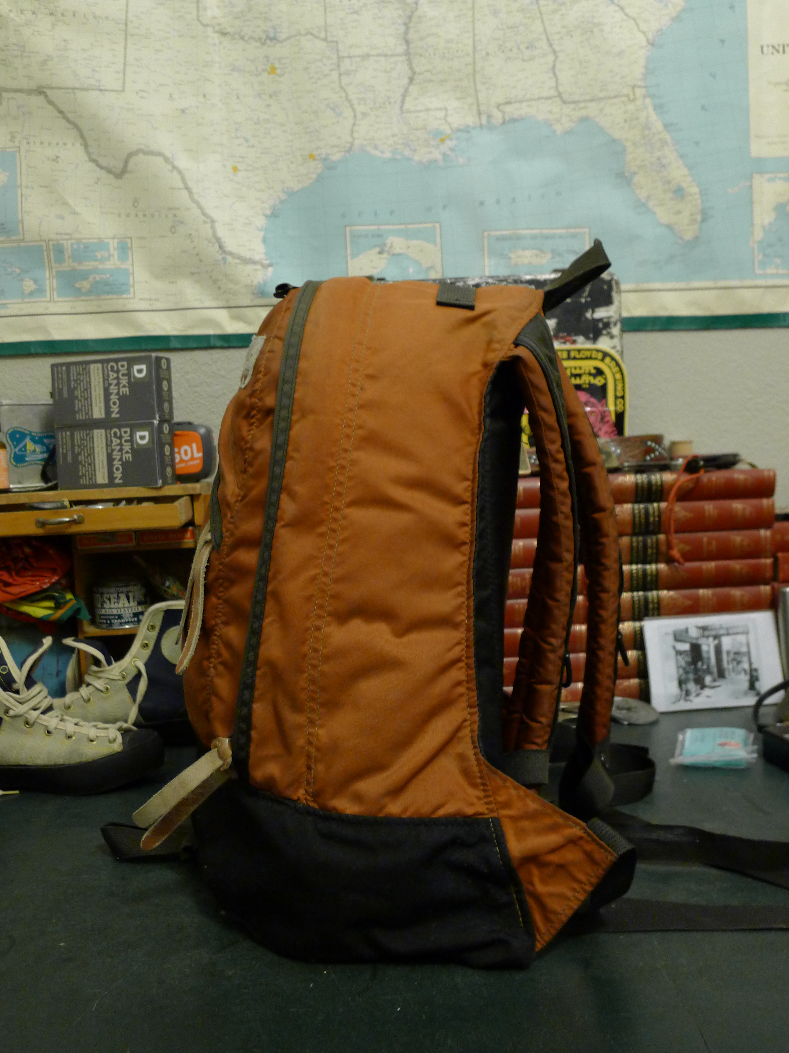 What looks like an over-sized day pack is thoughtfully designed with the wearer in mind. The bottom compartment, opens all the way around the waist into what are referred to as “dewlaps”. This compartment was meant to be stuffed full with a sleeping bag and other soft goods to create a firm base for the rest of the load to sit upon. The Velcro belt, enables a nice cinch around the waist and allows the load to ride on the wearer’s hips. “Let your hips shoulder the weight” one pack maker said in their advertisements. The top compartment is separated into to side-by-side silo pockets which is nice for equipment containing fuel, or anything that best rides upright. Reinforcing via rivets and nylon webbing ensured you could stuff this thing like a turkey without it splitting. When packed thoughtfully, it also helps maintain that center of gravity the company was going for. The top flap offers a good amount of space, but has no side gussets, so more practical for maps and smalls. An intentional design meant to keep from top loading weight of the pack.