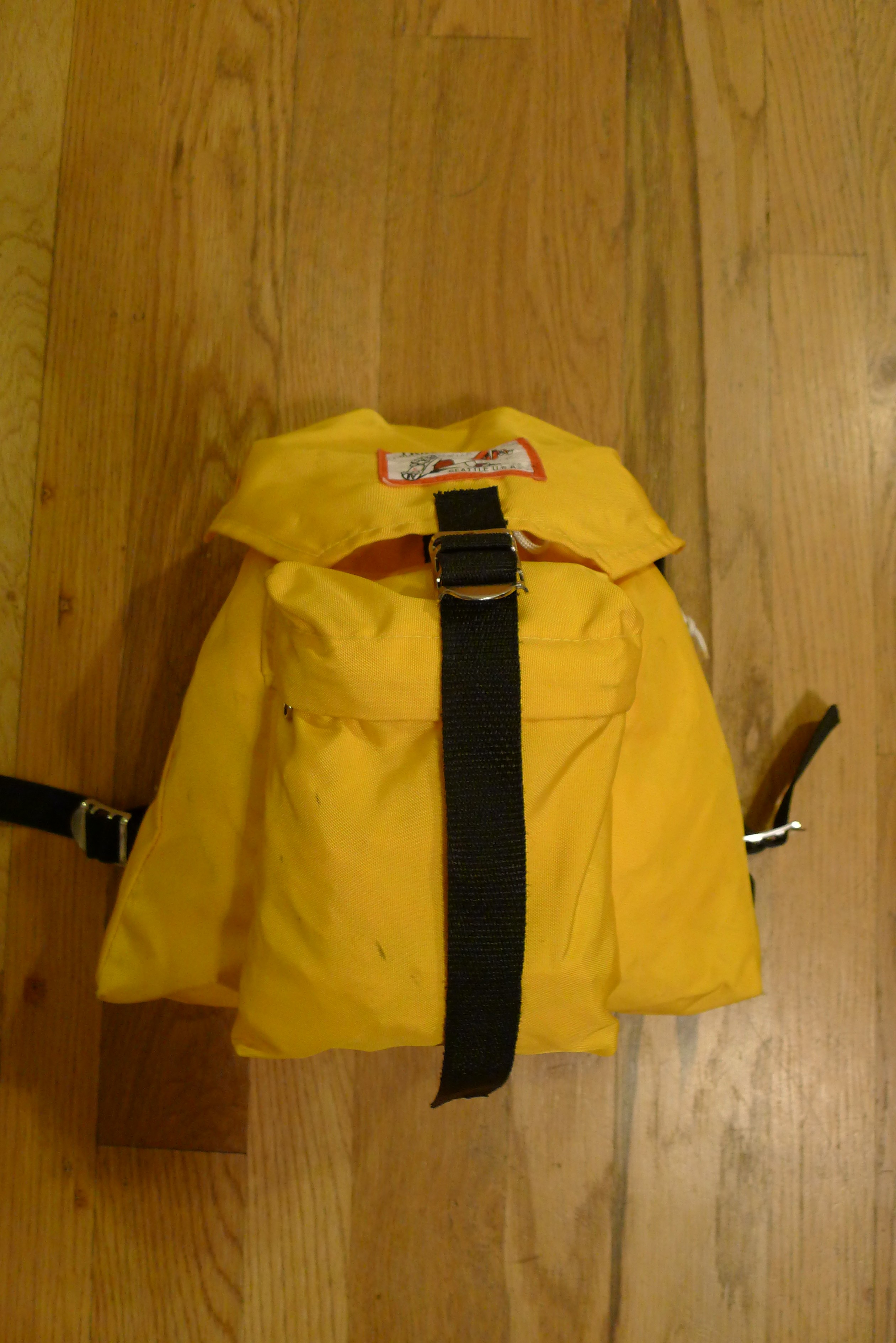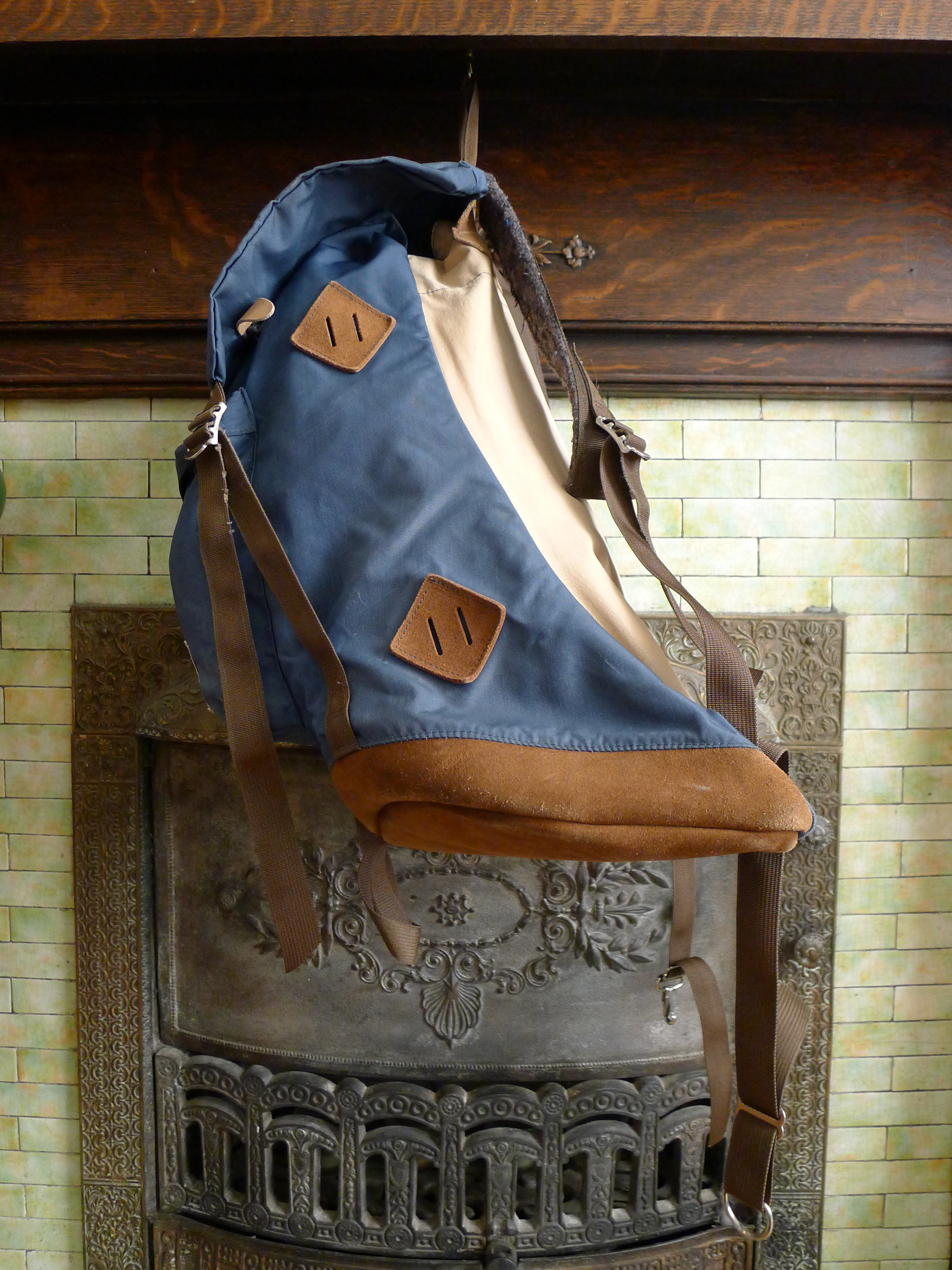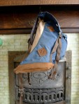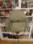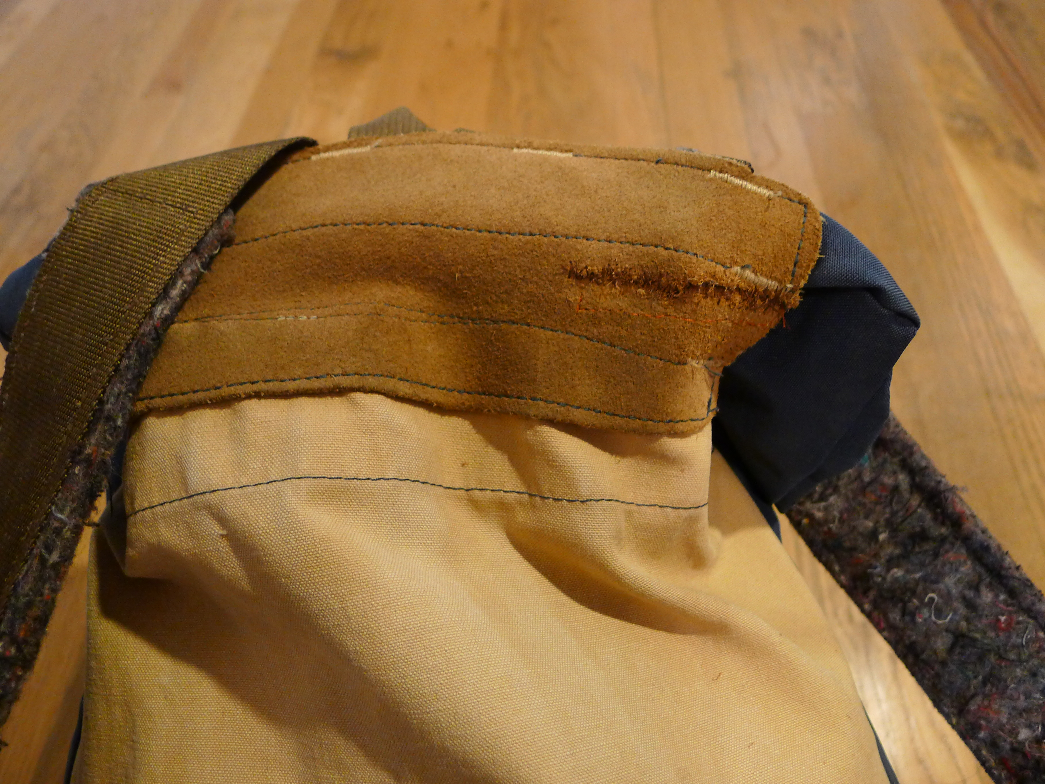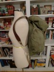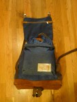 Two rods running the length of the back panel give the bag rigidness. An inch wide metal bow at the bottom of the bag is spanned by a cotton strap to offer padding and breathability at the waist. Top closure is completed by a cotton draw string through aluminum grommets and a canvas flap secured by leather straps. There is also an internal gator with cotton tie cord to further secure contents from the elements. One external pocket on the front of the pack is also secured by leather straps and metal buckles.