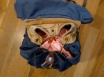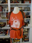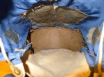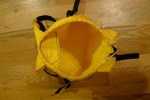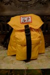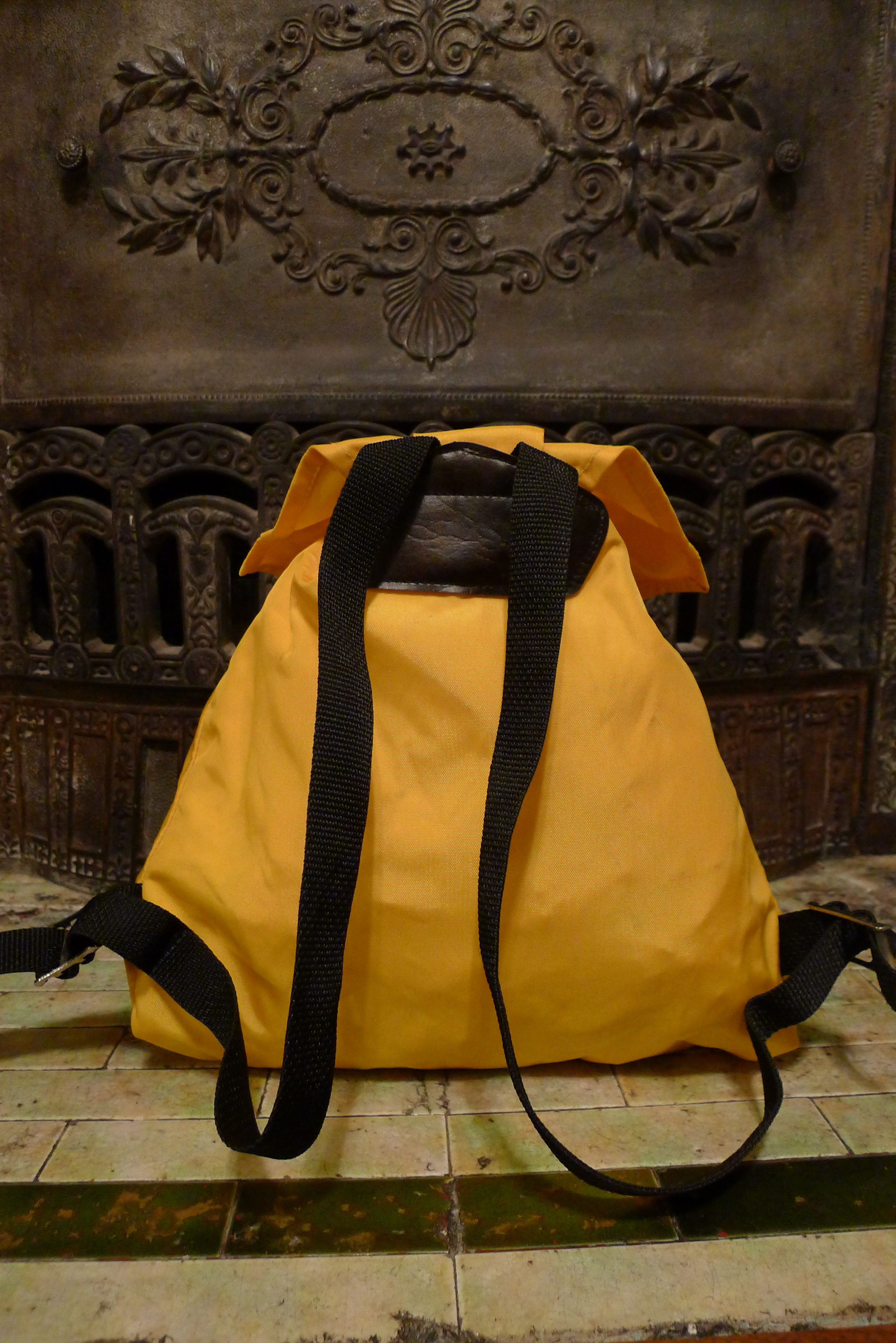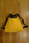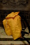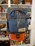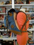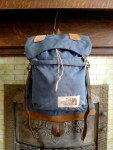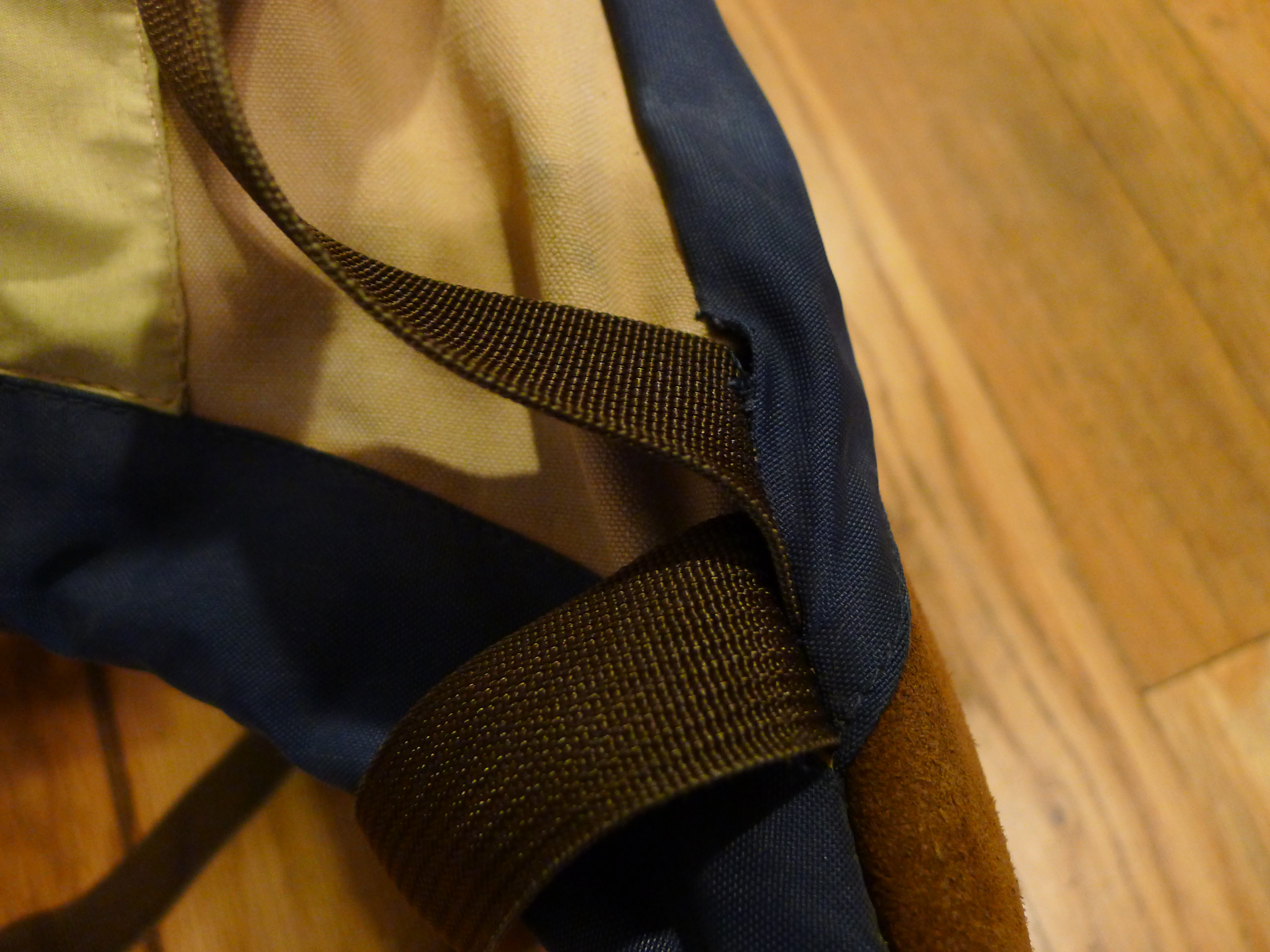 Two rods running the length of the back panel give the bag rigidness. An inch wide metal bow at the bottom of the bag is spanned by a cotton strap to offer padding and breathability at the waist. Top closure is completed by a cotton draw string through aluminum grommets and a canvas flap secured by leather straps. There is also an internal gator with cotton tie cord to further secure contents from the elements. One external pocket on the front of the pack is also secured by leather straps and metal buckles.