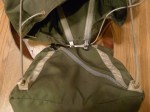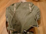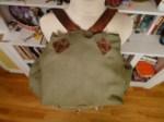 This bag is constructed of heavy duty green and white military canvas with leather and metal fittings. Thick leather straps are adjustable by buckle at the bottom for length; and at the top for slack from back plate. Both straps are anchored at the top by a large D ring. The left strap is hinged by a metal pin half way down, while the right is breakable by way of a hook and ring. Not sure what this was for, possibly ease of exit from a loaded pack, or to allow for strap accessories.