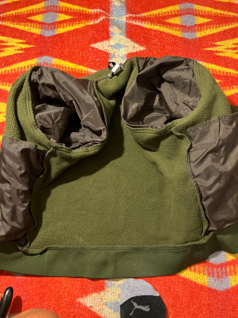 This quality fleece has nylon lined sleeves so undergarments don’t bunch. The patch is sewn onto the fleece but covered by the lining indicating it was added during production. There’s also something resembling a name bar adhered to the inside right chest. Pockets are also nylon lined.