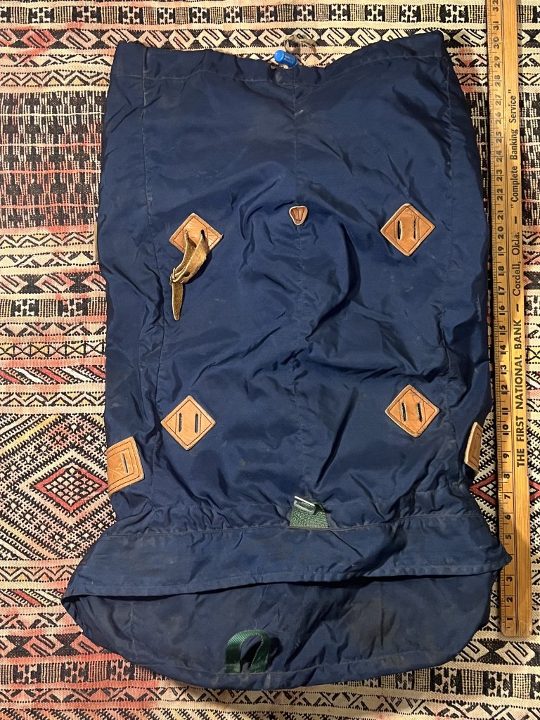 The material on the pack is pretty standard for the time. A heavy, coated nylon in a royal blue. Perhaps the biggest wow factor, aesthetically at least, comes from the green duck canvas backing which extends from just above the shoulder straps down to the inside of the “dewlaps”. With this pack adhered to he wearer’s back, I am sure the duck canvas offered at least some sweat absorption. Shoulder straps are reinforced with a riveted leather backer and feed down into the body of the pack. There’s an ergonomic crescent shape to them and they’re lightly padded. Standard leather lashing points adorn the body of the bag for side canister compartment attachments, axes, skis, poles or whatever else one would need for the adventure.