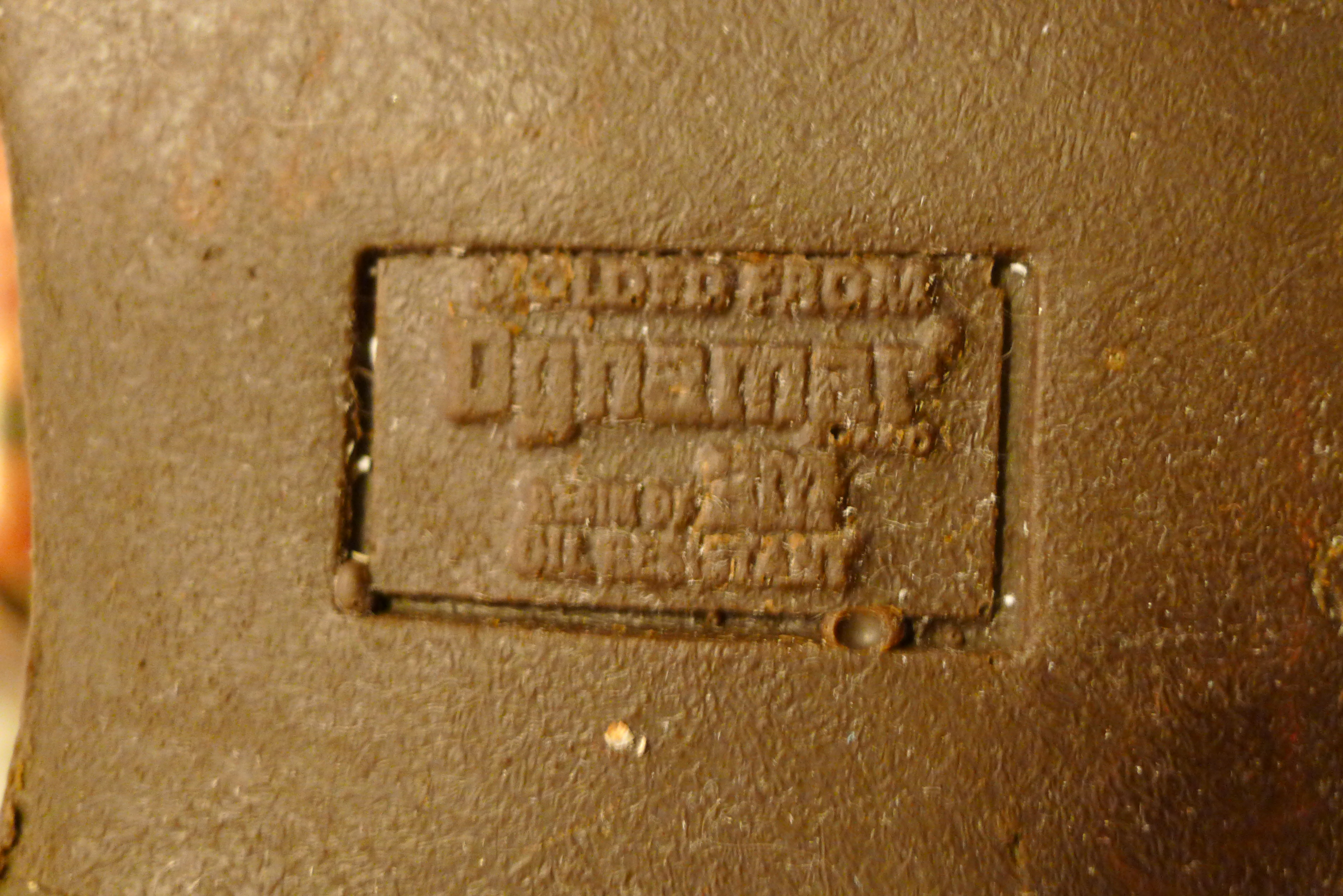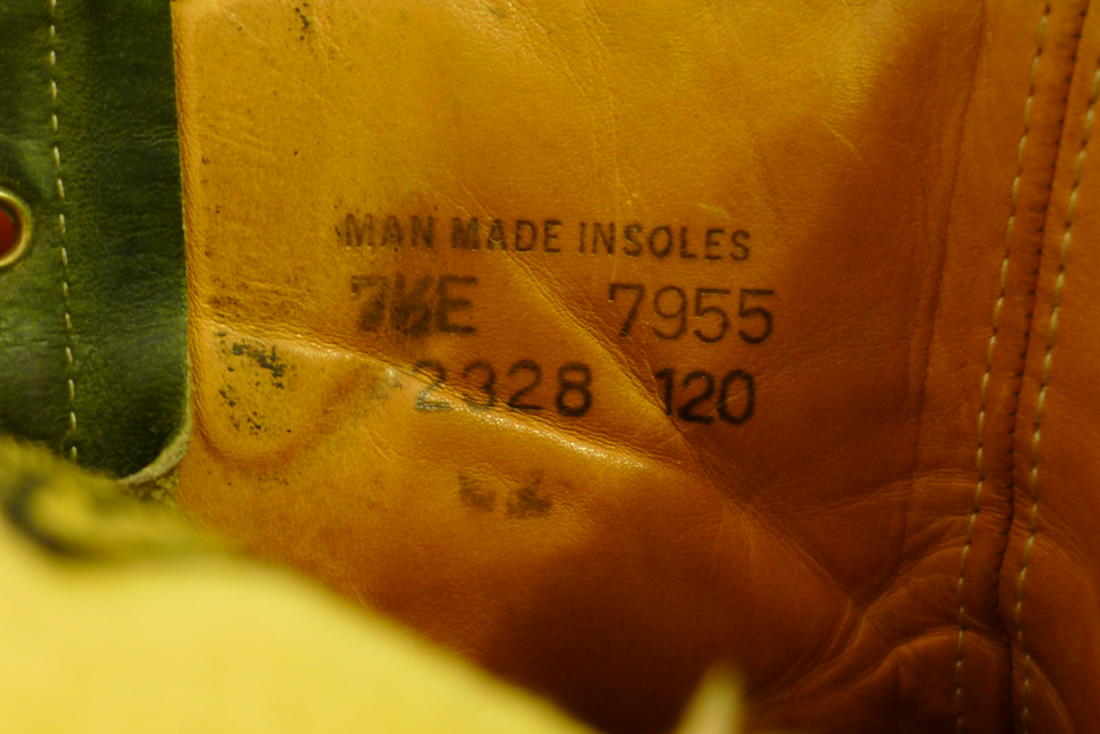 Neat pair of old black label Chippewa boots. The style is a 8″ round-toe hunting type boot. What makes these special is the olive green leather. Green leather was an option on boots makes and models from this time period, but you find green par is far less. The leather is died through therefore scuffs are a lighter shade of green instead of brown. The boots are lined inside with brown leather, but are not insulated. The back of the tongues are lined in a gold cotton blend material. These boots also feature a darker olive Dynamar crepe type sole. The boot feathers the embroidered black label in the right boot only. The embroidered label predates the screened and dates these boots back to the 1960s.