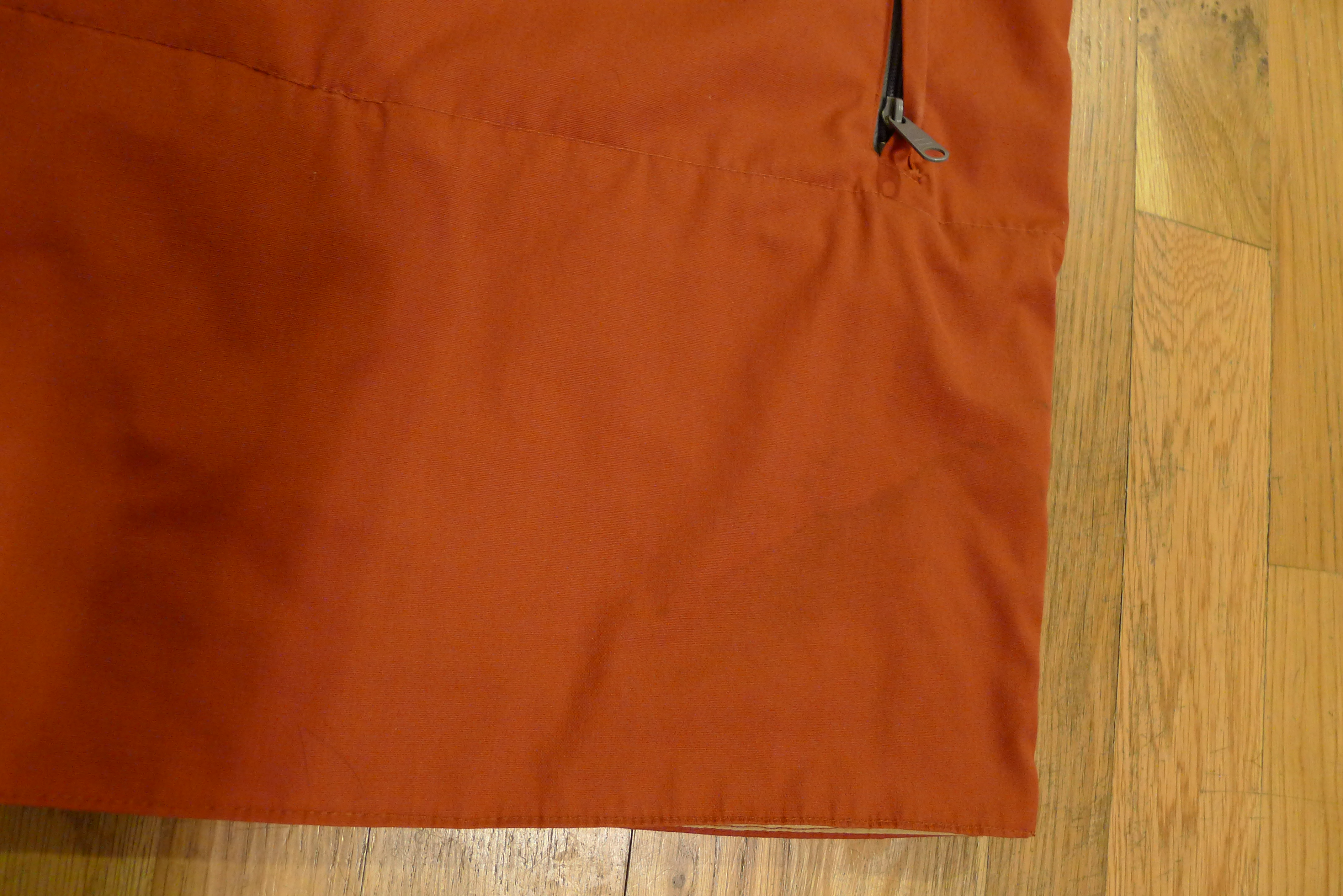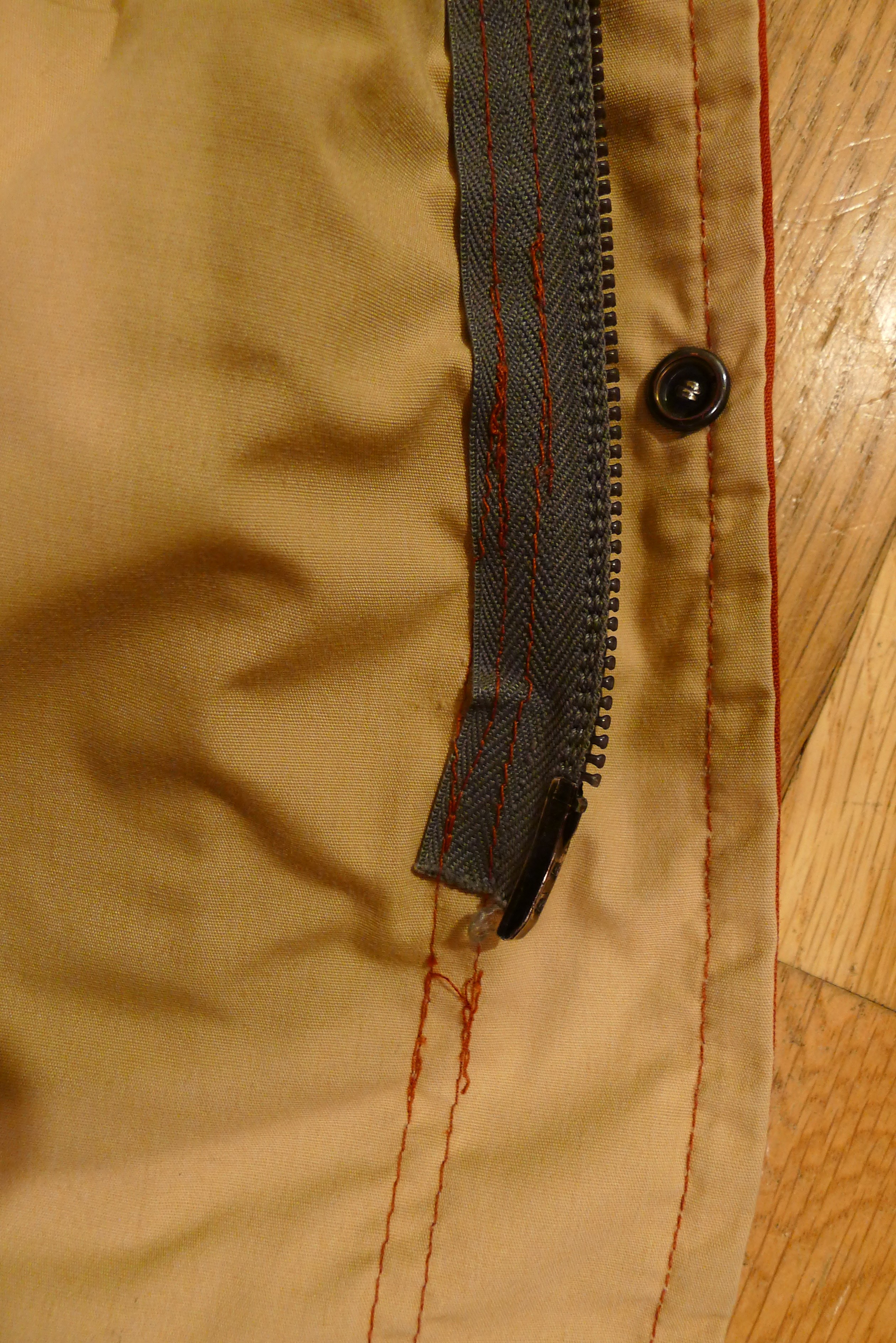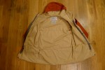 Cotton blend throughout, most likely 65/35 polyester cotton or similar (no materials tag). Double layer lined in khaki through out. 3 piece hood nylon draw cord. Two-way heavy gauge YKK sleeping bag zipper and snap front closure. Drawstring waist cinch and two snap adjustable cuff. Two top and side entry hip pockets. Left breast zippered pocket. Also, one zippered back pocket.
