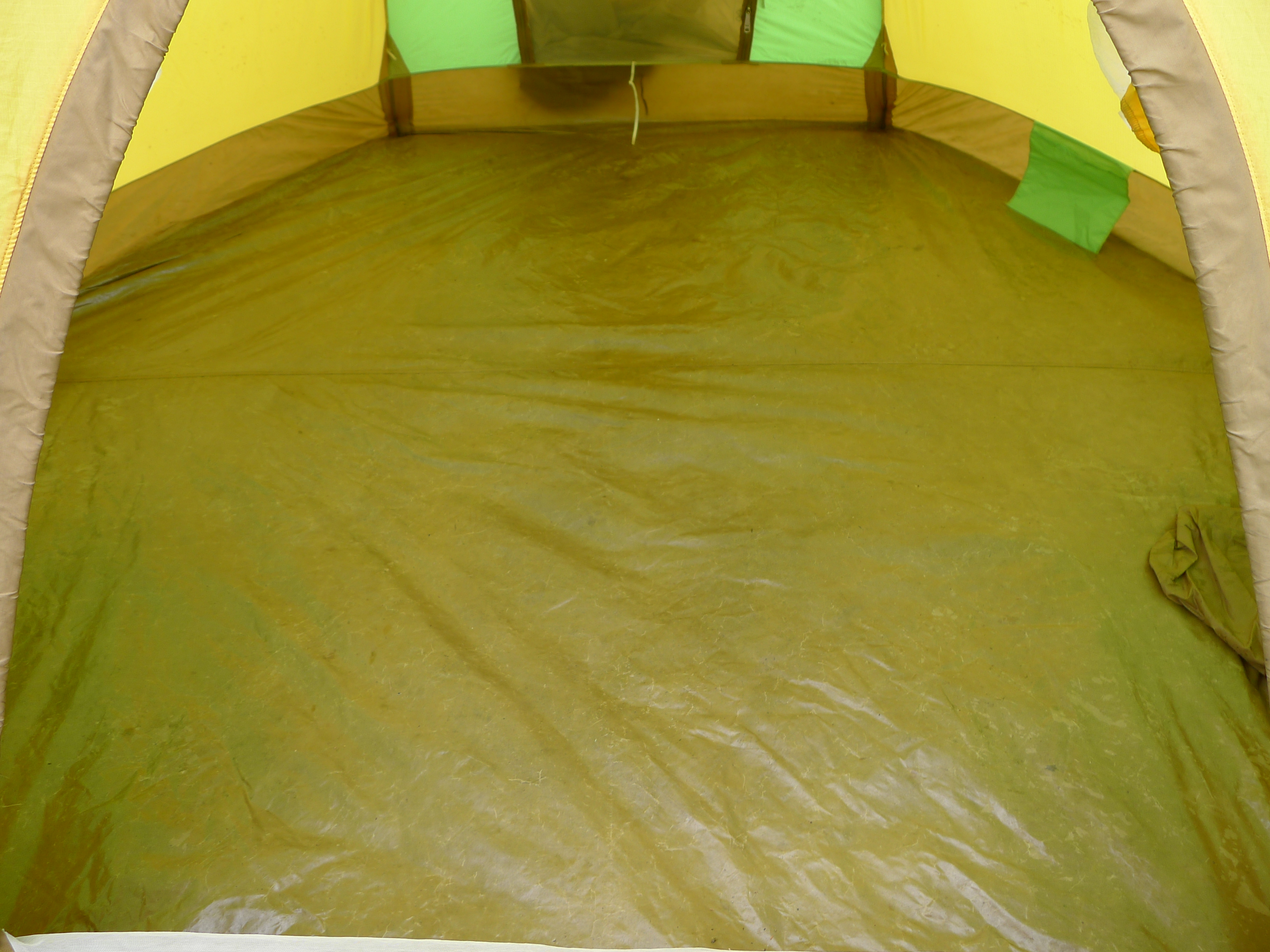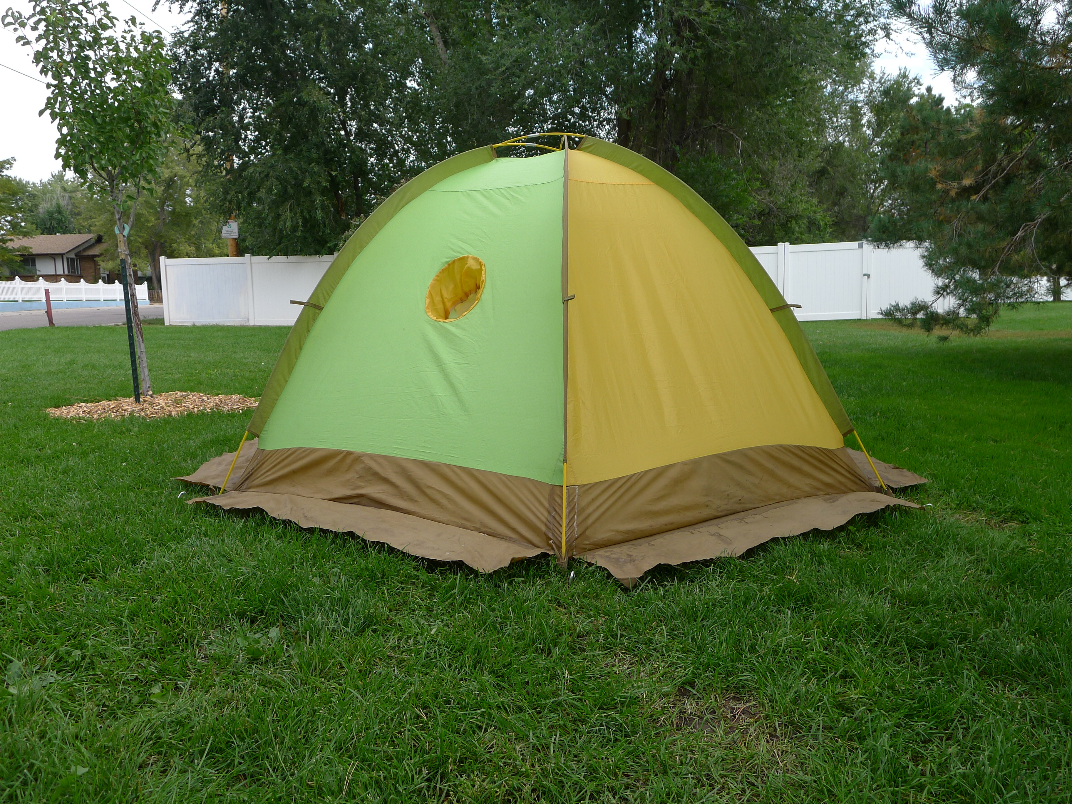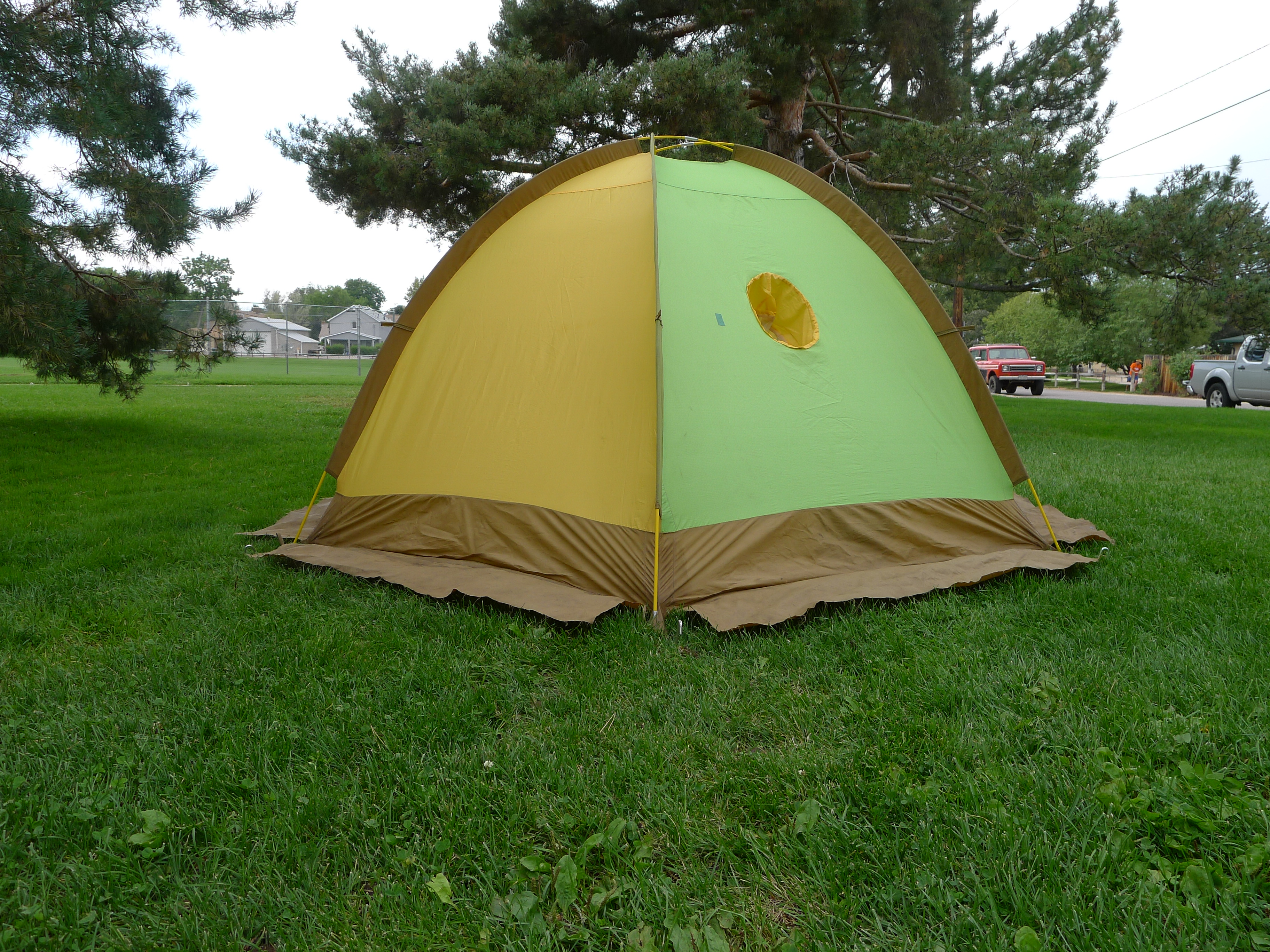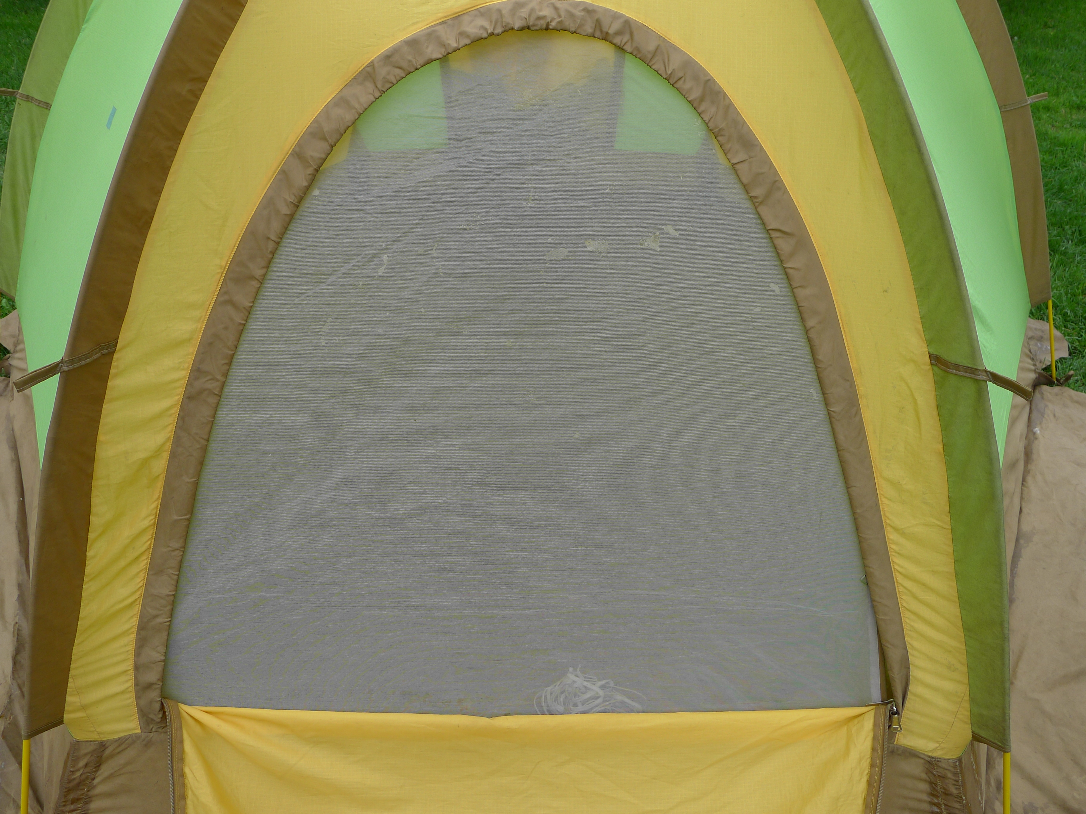 The tent is of course made from nylon. A fine ripstop version up top and a heavy coated nylon on the bottom. The thickness of the bottom would keep out melting snow and reduce the need for a ground cloth. The full fly is made of a tightly woven nylon to be water and wind resistant. The color block pattern is wild and right in line with early JanSport design and marketing.