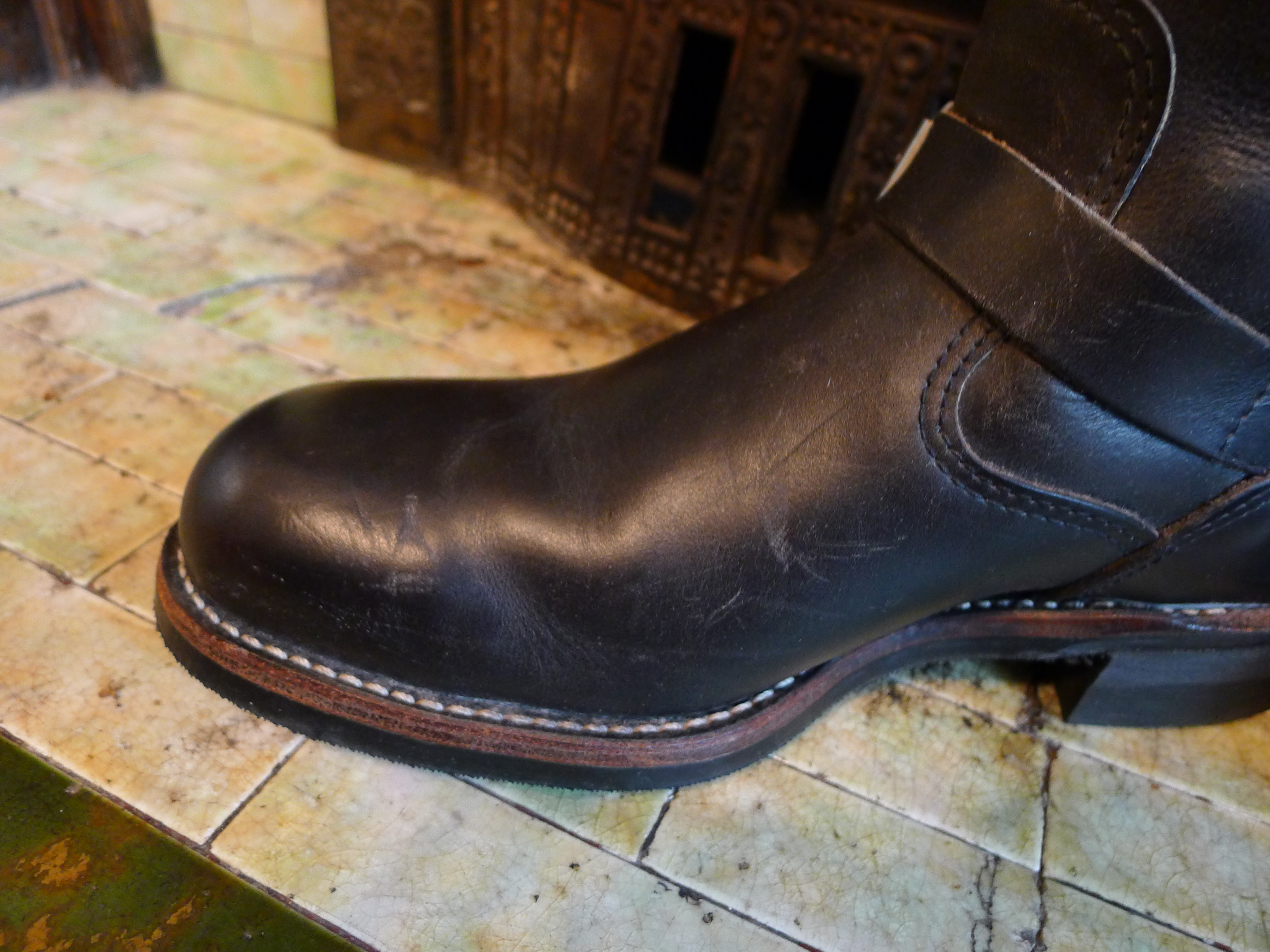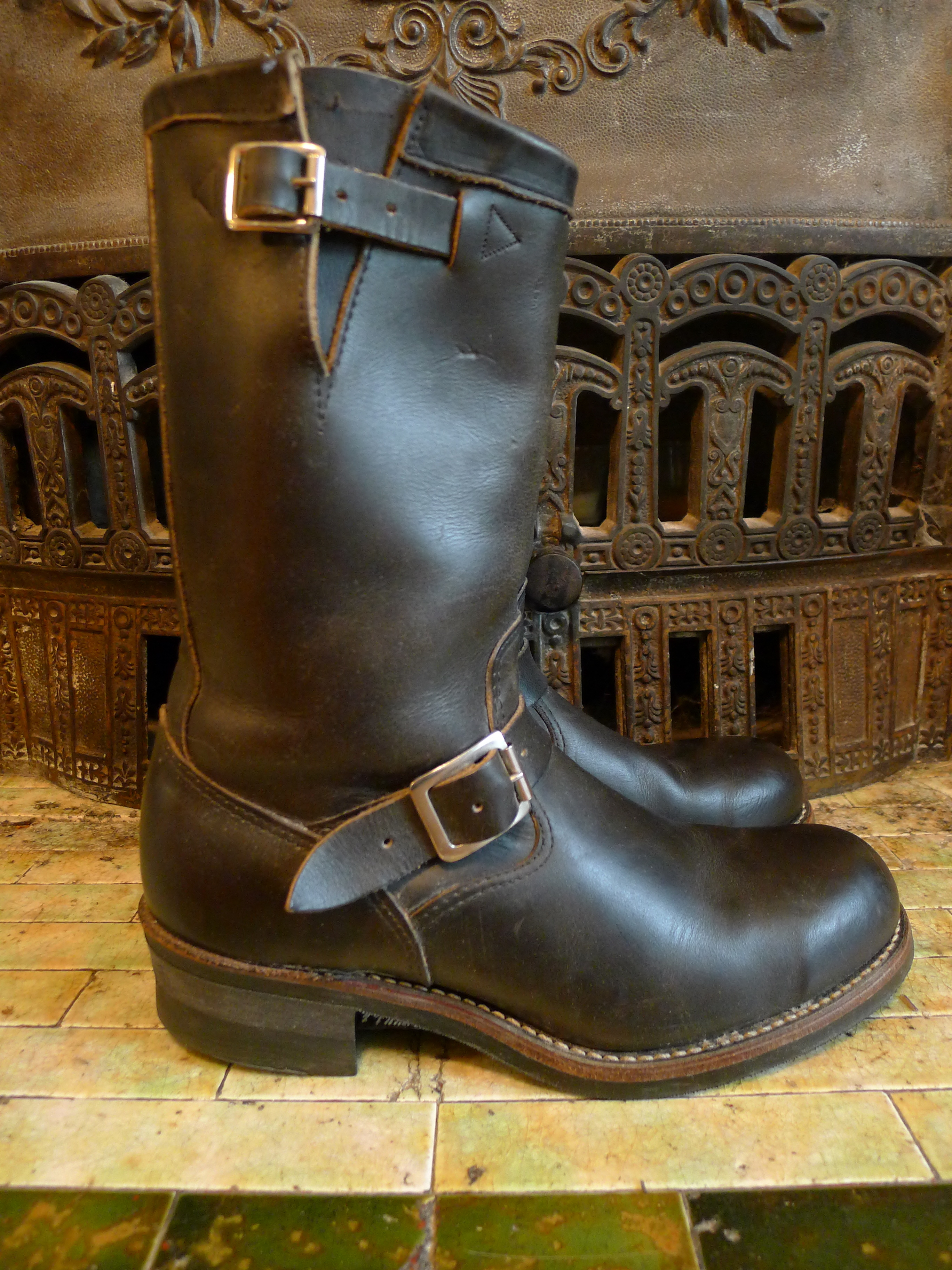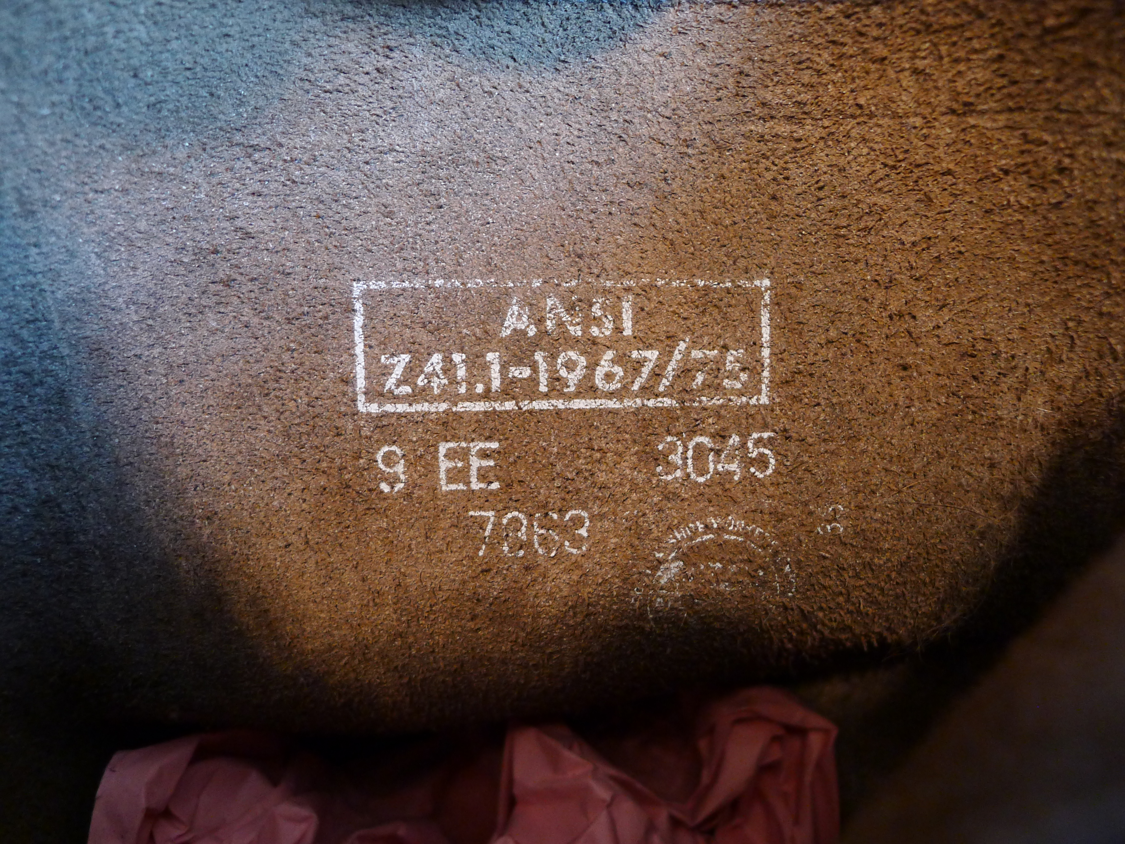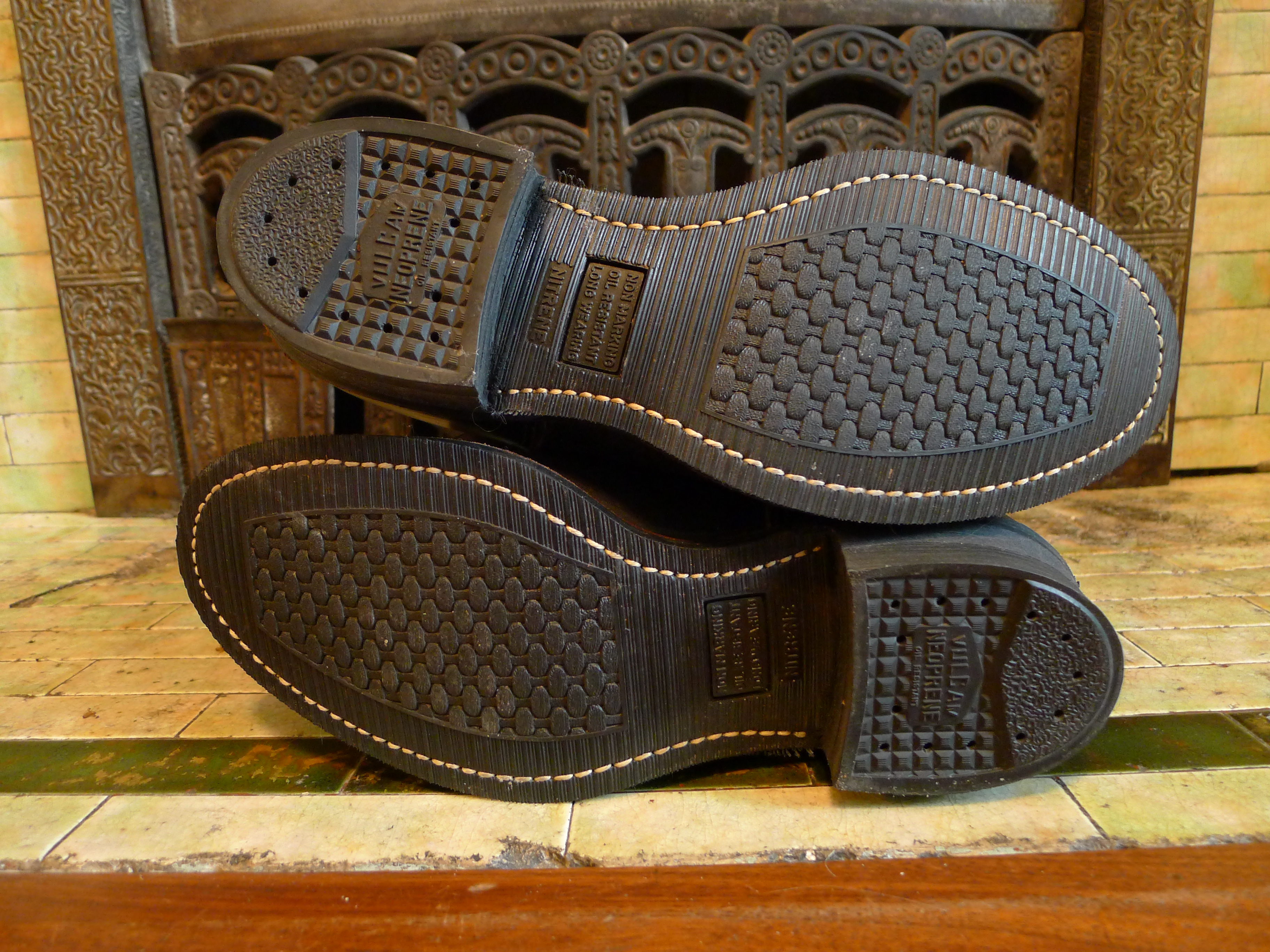 These boots, marked 27022, are seemingly rare and I have found no further information on them. They are a 5″ high, four eyelet, three loop lace-up with steel toe and one inch heel. The soles are a gum composite stamped Red Wing on both sole and heel with a tread pattern made of tiny Red Wing logos. All markings are contained on the inside ankle of the boot and not on the tongue. The single label on the inside of the boot suggests they may be from the 60s or 70s, though the look of this pair out dates that. The welt is a rubber, “storm” type around the front and leather around the heel.