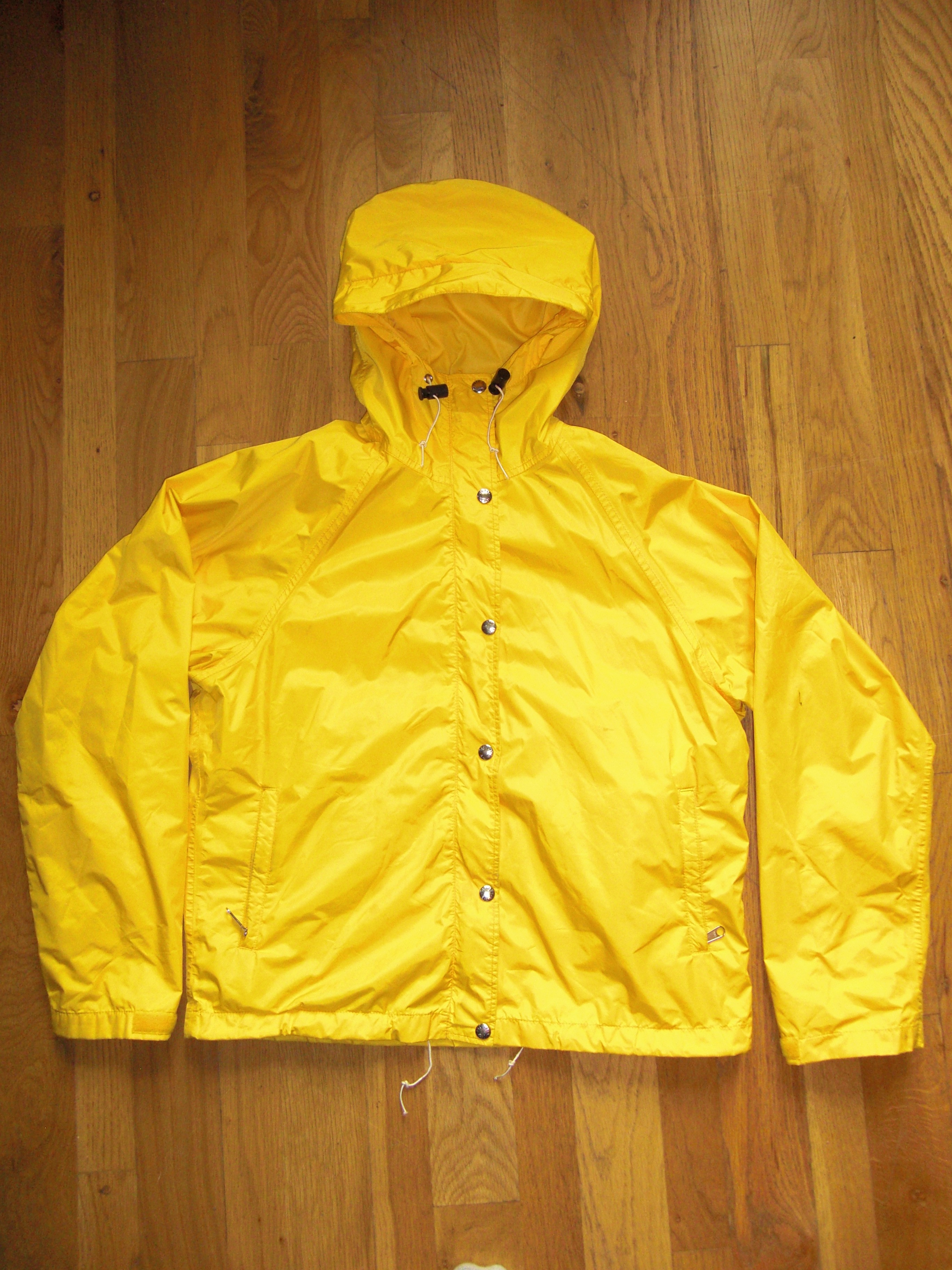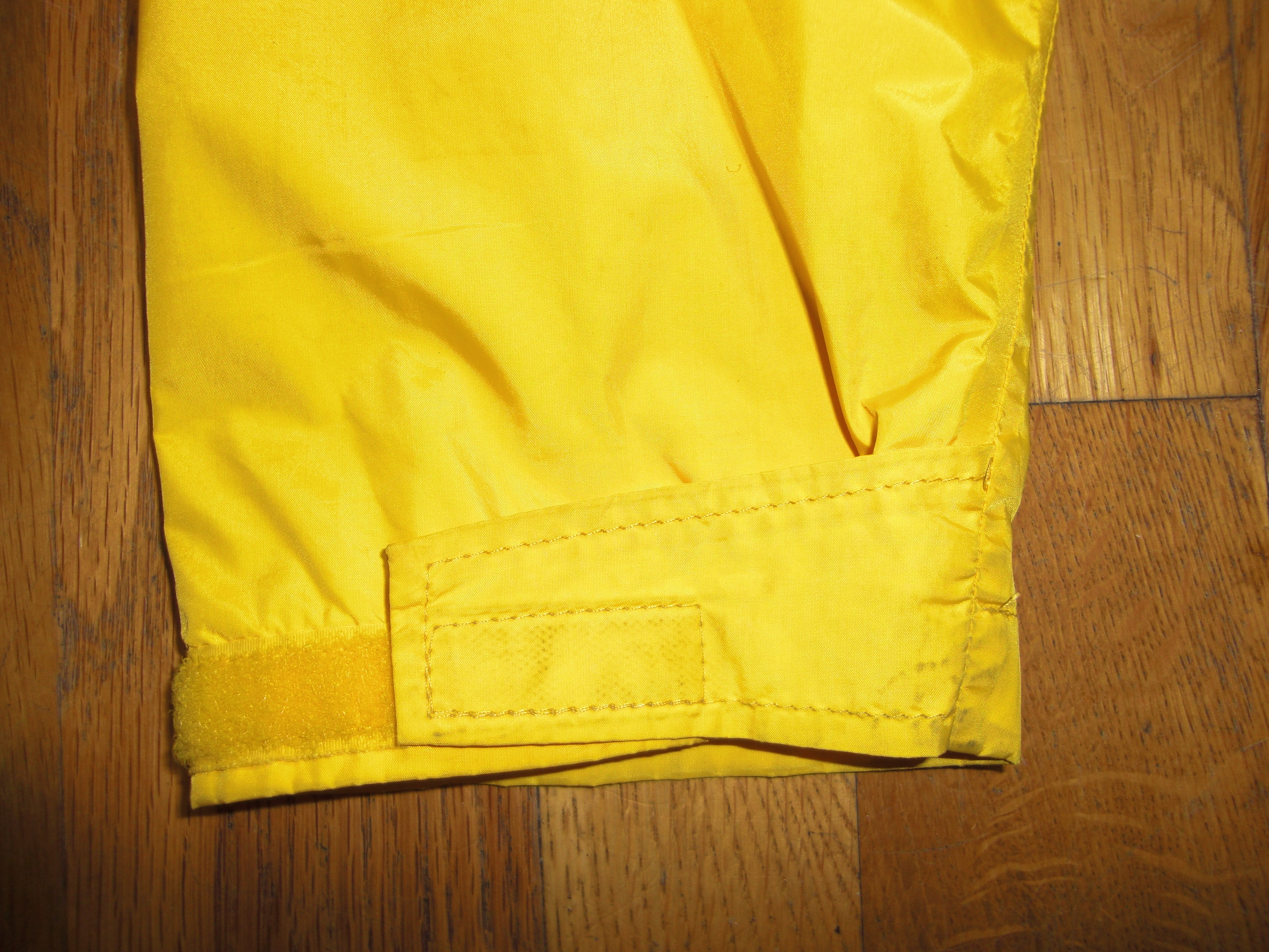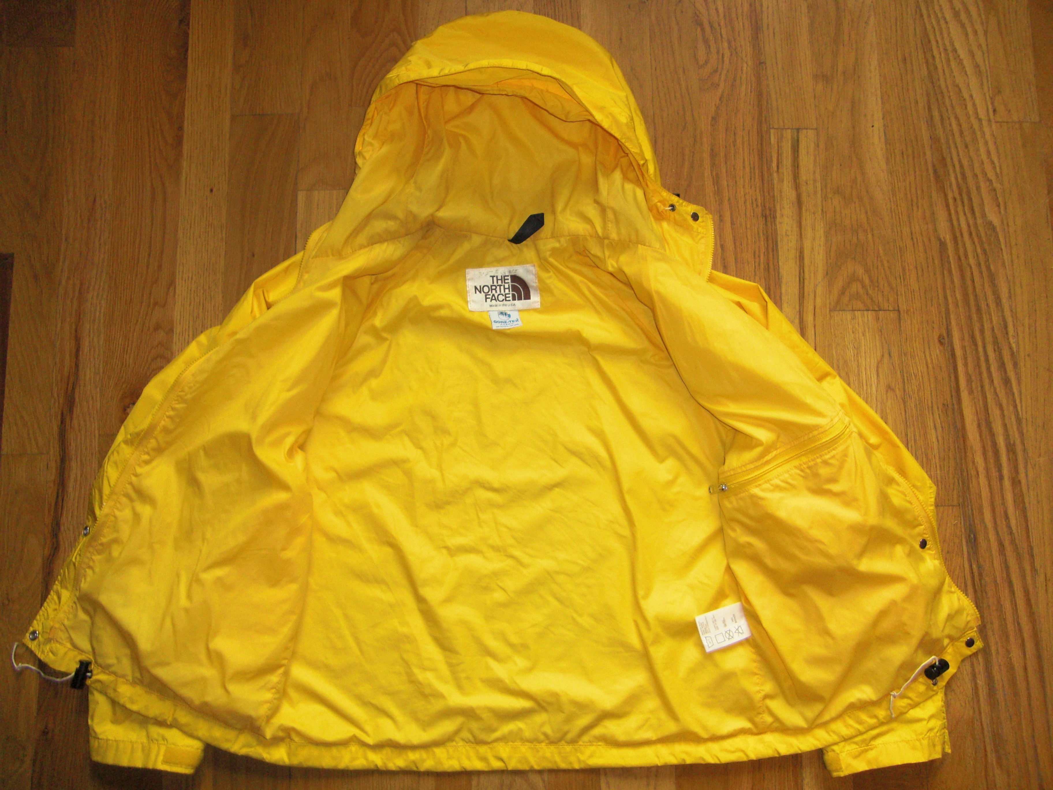 This North Face Gore-Tex jacket is quite the piece. Full Gore-Tex outer and nylon inner lining. It’s as yellow as a pvc rain coat but rest assured its not. Very stylish and still functional as a windbreaker, the Gore-Tex has lost most of its repellent properties but could be treated with an aftermarket treatment if one so desired. The label boast the remnants of the former owners last name in faded permanent marker. and from the W-L tag it’s assumed a women’s large but it fits like a short mens medium as well (see measurements).